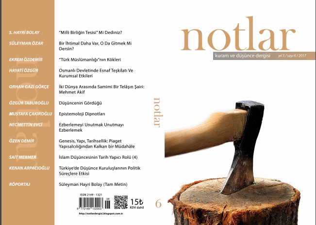 * Notlar’ın 6. sayısı kafa karışıklığının yine had safhaya vardığı bir zamanda çıktı. Yeni sayımız yine dolu bir sayı oldu. Bağırmanın, eyyamcılı- ğın, rol yapmaların, artistik düşüncelerin revaçta olduğu bir ortamda, bir zeminde bağırmamayı, sükuneti, sahiciliği ve hakikati önceleyen tavrımı- zı sürdürüyoruz. Notlar ile bir inancı ortaya koyduk. Hiç bir taviz vermeden, tavır olarak, üslup olarak, çizgi olarak istikrarımızı hakikatin yoluna koyduk. Bu inanç çevresinde bir araya geldiysek, ne mutlu, gelemediklerimizle ise sefer halimizi sürdüreceğiz. Yeni sayıda düşüncenin sınırlarını zorlamayı sürdürdük. Prof. Dr. Sü- leyman Hayri Bolay’ın 15 temmuz merkezli yazısına özel bir yer açmak gerekiyor. Bolay Hoca, hem bir zihniyet analizi yaparken, sadece darbeci zihniyeti eleştirmekle kalmamış, aynı zamanda somut önerilere de yer veriyor yazısında. Milli eğitim sistemindeki zihniyetin nasıl değişeceği, gençlerin nasıl bir eğitim sürecine girmesi gerektiği gibi hususları geniş birikimi ve tecrübesi ile ele aldı Bolay Hoca. Her sayıda, gayretleriyle bu zor yürüyüşümüze ortak olan yazarlarımıza da teşekkür ediyoruz. Bu zor ve sarp yokuş onlar olmasa daha da zor olacaktı. Selamlarımızı sunuyoruz.