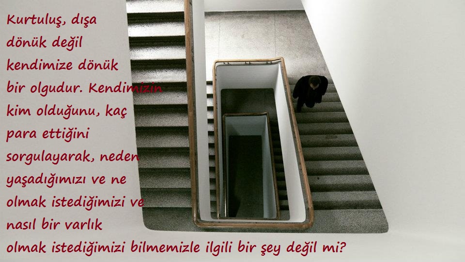 Kurtuluş, dışa dönük değil kendimize dönük bir olgudur. Kendimizin kim olduğunu, kaç para ettiğini sorgulayarak, neden yaşadığımızı ve ne olmak istediğimizi ve nasıl bir varlık olmak istediğimizi bilmemizle ilgili bir şey değil mi?