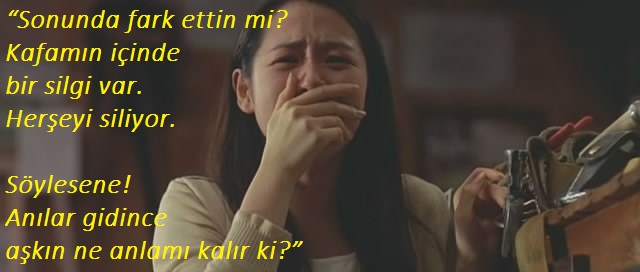 "Üzgünüm. Çok üzgünüm... Asla kalbini kırmak istemedim. Tanrım ben ne yapmışım? Şimdi ağlıyor musun? Seni ağlarken veya acı çekerken görmek istemedim. Seni mutlu etmek istedim. Ama tüm yapabildiğim sana ıstırap vermek. Chul-Soo! Aşkım Chul-Soo... Beni yanlış anlama. Ben sadece ama sadece seni sevdim. Sadece seni düşünüyorum. Yalnız seni hatırlıyorum. Sana kalbimin derinliklerini göstermek ne kadar zor! Hafızamın geriye kalanıyla bunu yapmam mümkün mü? Kalbim hızla çarpıyor. Ben, Kim Su-Jin sadece Choi Chul-Soo'yu seviyorum. Bunu unutmak istemiyorum ve unutmayacağım. Bunu anlıyor musun? Benim hislerimi anlıyor musun? Korkarım benim geri dönen hafızam sana herşeyi söylemeden önce beni yine bırakacak. Söylemeliyim. Seni seviyorum. Ve üzgünüm. Seninle tanıştım çünkü unutkandım. Senden ayrılıyorum çünkü unutkanım. Sen başıma gelen en güzel şeysin. Seni bana gönderdiği için Allah'a ne kadar şükretsem azdır. Seni hatırlamayacağım. Sen benim bir parçamsın. Senin gibi gülümser, güler ve kokarım. Seni unutabilirim, ama hiç bir şey seni benim içimden söküp atamaz. Gerçi sen bana hiç beni sevdiğini söylemedin ama kalbimin derinliklerinde biliyorum ki sen de beni seviyorsun. Seni bıraktığım için beni affet. Lütfen..."