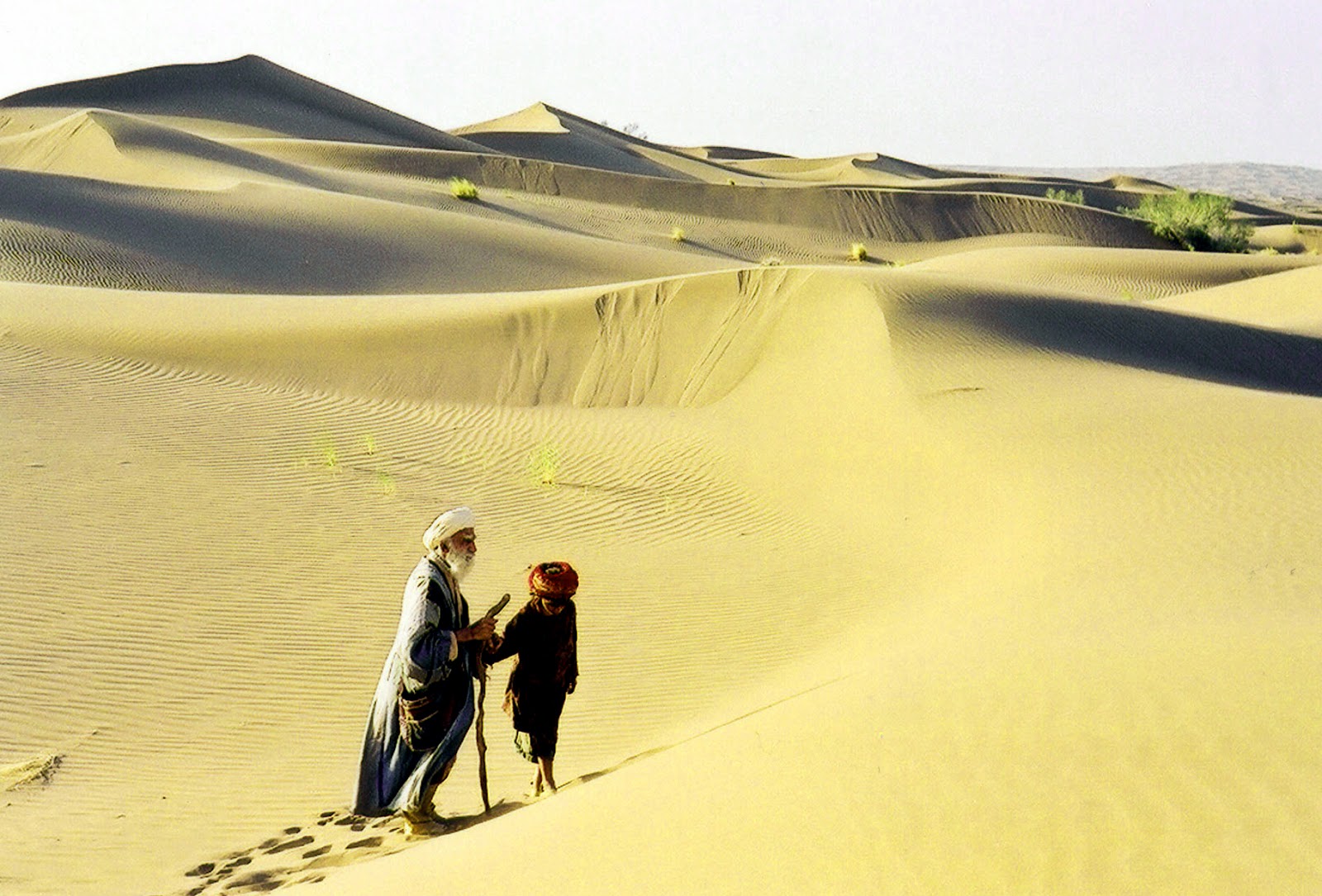 Filmin konusu hakkında bir şeyler söylemek lazım : Bab’ Aziz metaforlarla işlenmiş , çölde geçen, bir yol filmi. Gecenin karanlığında çölde bir silüet belirir; bir çoban silüetidir bu ve ardından bir kız topraktan çıkar diri diri. Kız çocuklarını toprağa diri diri gömen cahiliye devrine yapılan alegorik bir atıftır bu. Başlangıç ve son… İslamiyet ve Cahiliye… Sonra secde hâlinde kum altında kalan ‘bilge dede’ de çıkınca karşılıklı konuşmalarla filmin o muhteşem atmosferine gireriz. ‘’ Dedeciğim tek başımıza bu çölde yolumuzu nasıl bulacağız, ya kaybolursak?’’ – ‘’ İnancı olan kişi asla kaybolmaz, küçük meleğim!’’